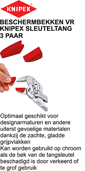 @& BESCHERMBEKKEN VR KNIPEX SLEUTELTANG 3 PAAR Optimaal geschikt voor designarmaturen en andere uiterst gevoelige materialen dankzij de zachte, gladde grijpvlakken Kan worden gebruikt op chroom als de bek van de tangsleutel beschadigd is door verkeerd of te grof gebruik