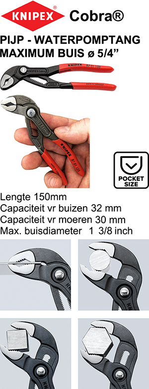 Info: Cobra® PIJP — WATERPOMPTANG MAXIMUM BUIS e 5/4” Lengte 150mm Capaciteit vr buizen 32 mm Capaciteit vr moeren 30 mm Max. buisdiameter 1 3/8 inch i