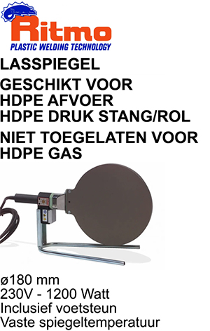 äil:mn ruste nas reemater LASSPIEGEL GESCHIKT VOOR HDPE AFVOER HDPE DRUK STANG/ROL NIET TOEGELATEN VOOR HDPE GAS 2180 mm 230V — 1200 Watt Inclusief voetsteun Vaste spiegeltemperatuur