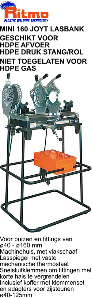 Info: € ruse an venaaer MINI 160 JOYT LASBANK GESCHIKT VOOR HDPE AFVOER HDPE DRUK STANG/ROL NIET TOEGELATEN VOOR HDPE GAS Voor buizen en fittings van 040 — #160 mm Machinehuis, met vlakschaaf Lasspiegel met vaste mechanische thermostaat Snelsluitklemmen om fittingen met korte hals te vergrendelen Inclusief koffer met klemmenset en adapters voor zijsteunen 240—125mm
