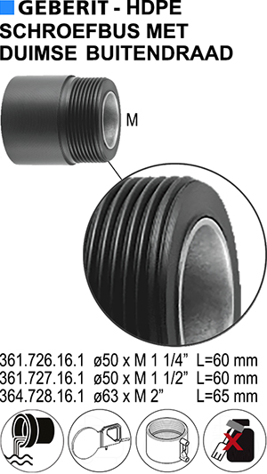 GEBERI — HDPE SCHROEFBUS MET DUIMSE BUITENDRAAD 361.726.16.1 050 x M 1 1/4” L=60 mm 361.727.16.1 050 x M 1 1/27 L=60 mm 364.728.16.1 663 x M 27 L=65 mm 9) (2