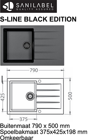 Info: <1 SANILABEL S—LINE BLACK EDITION 375 —— Buitenmaat 790 x 500 mm Spoelbakmaat 375x425x198 mm Omkeerbaar
