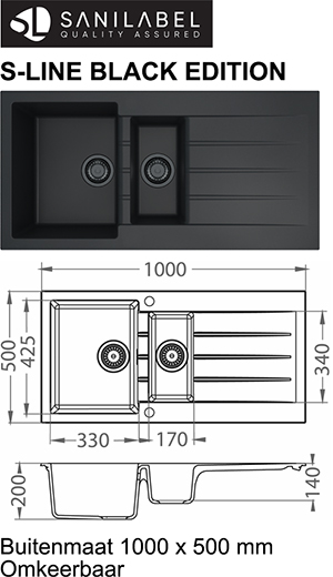 Omschrijving: S-LINE BLACK SPOELTAFEL COMPOSIET 1000x500 ZWART