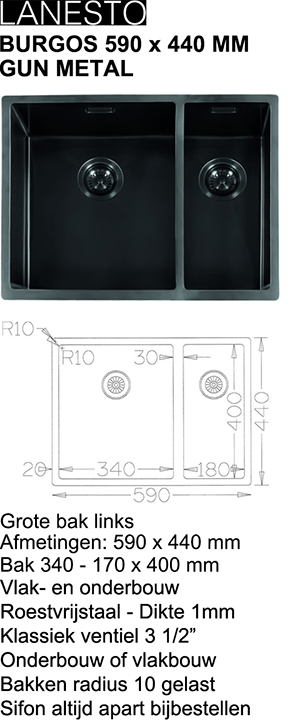 BURGOS 590 x 440 MM GUN METAL Grote bak links Afmetingen: 590 x 440 mm Bak 340 — 170 x 400 mm Vlak— en onderbouw Roestvrijstaal — Dikte 1mm Klassiek ventiel 3 1/2° Onderbouw of vlakbouw Bakken radius 10 gelast Sifon altijd apart bijbestellen