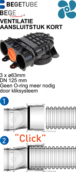 Info: _. BEGETUBE @©9 BEGE .. ‘ VENTILATIE AANSLUITSTUK KÒRT 3 x o63mm DN 125 mm Geen O—ring meer nodig door kliksysteem