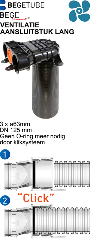 Info: BEGETUBE @©9 BEGE . tB VENTILATIE AANSLUITSTUK LANG 3 x a63mm DN 125 mm Geen O—ring meer nodig door kliksysteem