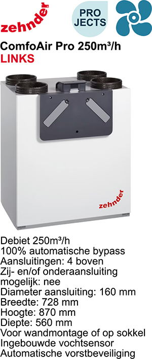 Omschrijving: ZEHND VENT COMFOAIR PRO 250 RF RH 250M²/H LINKS