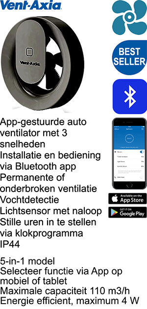 App—gestuurde auto ventilator met 3 snelheden Installatie en bediening via Bluetooth app Permanente of onderbroken ventilatie Vochtdetectie Lichtsensor met naloop Stille uren in te stellen via klokprogramma IP44 5—in—1 model Selecteer functie via App op mobiel of tablet Maximale capaciteit 110 m3/h Energie efficient, maximum 4 W